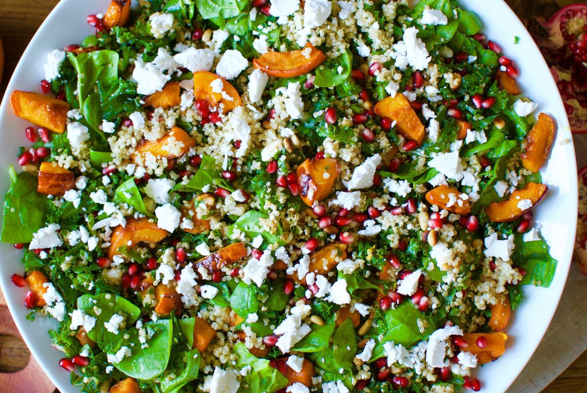 2. Remove from the oven and cool. To a large serving bowl, add cooked couscous, pomegranate seeds, spinach and arugula and the cooled butternut squash and toss to combine.