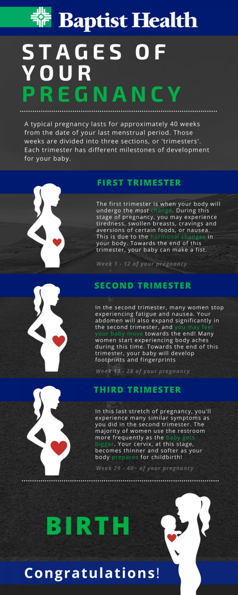 Is this your first pregnancy? Congratulations, either way! It’s important to be aware of what’s going on during your pregnancy. Baptist Health has created the following infographic to help you visualize what your pregnancy will look like, and how your baby is developing!