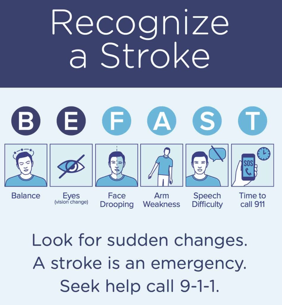 BE FAST is an easy way to remember the sudden signs of stroke. When you can spot the signs, you’ll know when you need to call 9-1-1 for help. The sooner the person having a stroke receives medical care, the better their chances of survival and recovery will be.