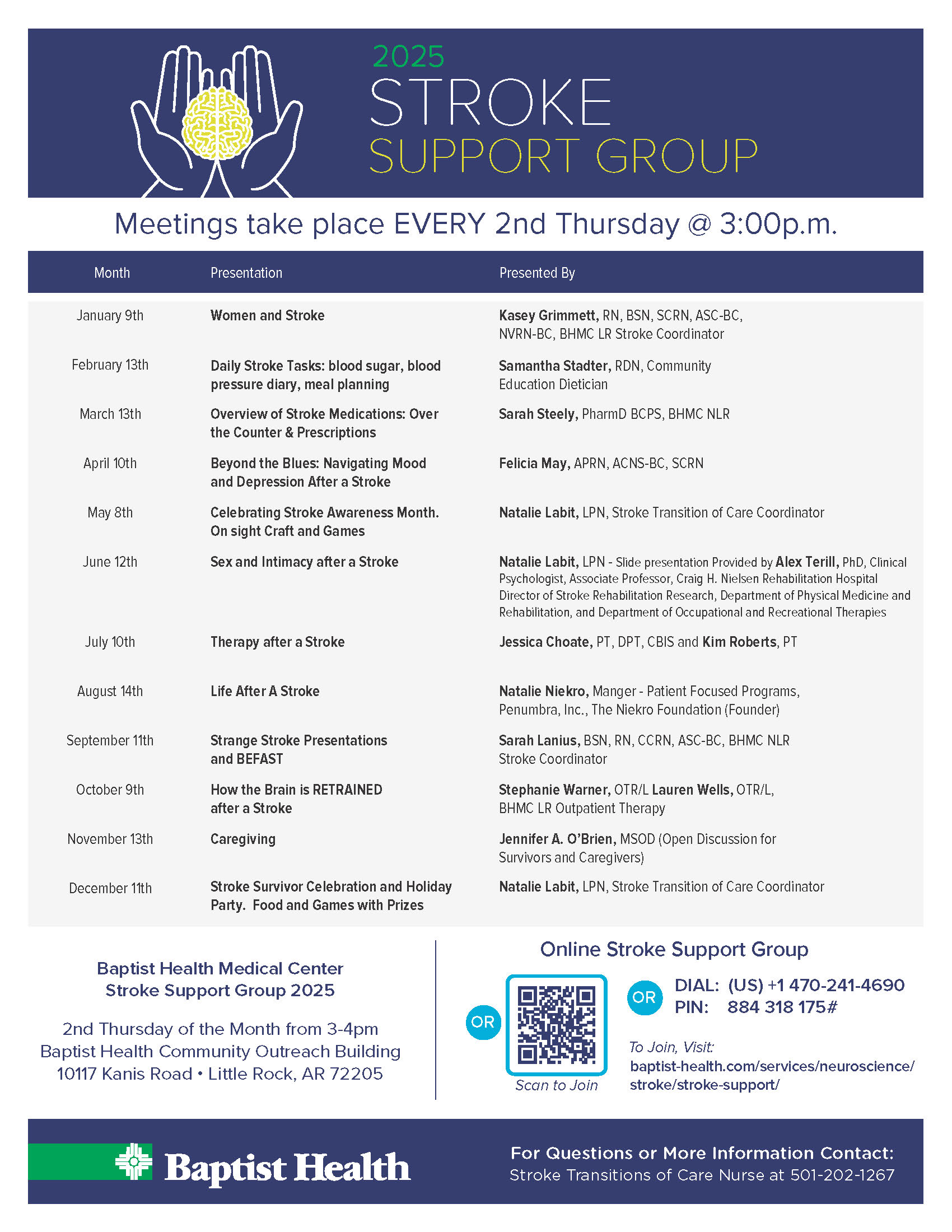 Offered on site at 10117 Kanis Road in Little Rock, AR 72205 and via Google Meet on the second Thursday of each month at 12:30 p.m.