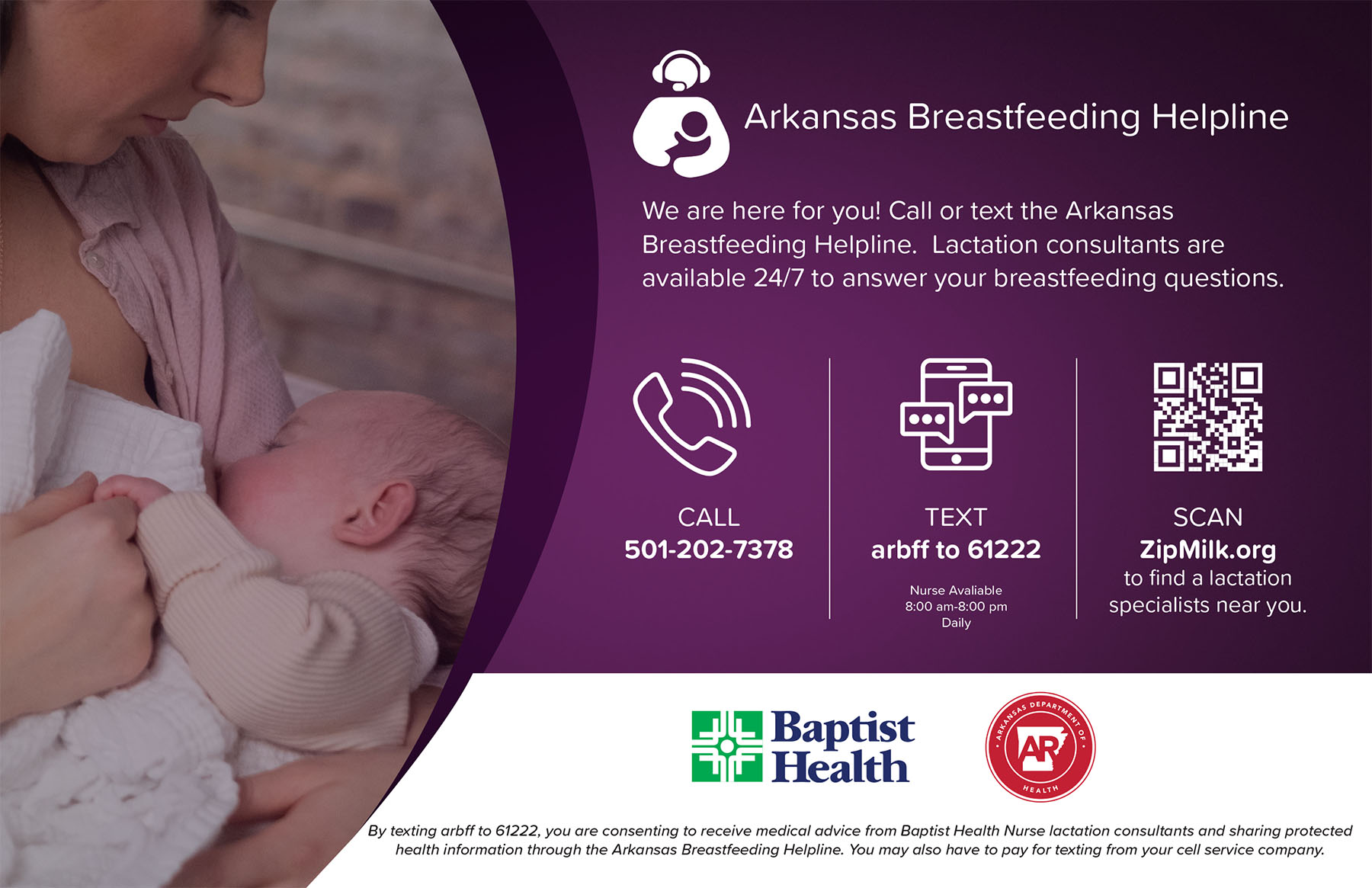 Thanks to a partnership between Baptist Health and the Arkansas Department of Health, Mothers in Arkansas can get all of their breastfeeding questions answered by an IBCLC certified Lactation consultant. Texting is now available! 8 a.m. – 8 p.m. or moms can call and speak with the lactation consultant 24/7
